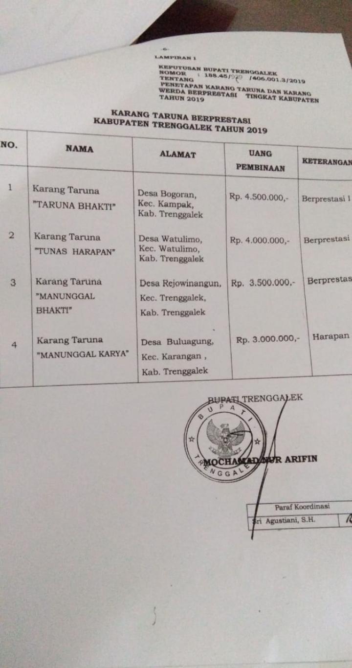 Karangtaruna Taruna Bhakti Desa Bogoran mendapatkan juara 1 dalam lomba karang taruna berprestasi se Kabupaten Trenggalek tahun 2019 yang diadakan oleh Dinas Sosial PPPA Kabupaten Trenggalek. Karangtaruna Taruna Bhakti harus melewati dua tahapan penilaian sebelum dinobatkan sebagai juara pertama. Tahap pertama, penilaian profil karangtaruna yang telah dibuat oleh masing-masing karangtaruna dan wawancara perwakilan anggota karangtaruna. Wawancara dilakukan oleh perwakilan Dinas Sosial PPA Kabupaten Trenggalek di gedung Bhawarasa Kabupaten Trenggalek. Pada tahap pertama tersebut diambil empat karangtaruna dengan nilai tertinggi. Keempat karangtaruna tersebut mengikuti penilaian tahap kedua. Pada tahap kedua Dinas Sosial PPPA Kabupaten Trenggalek melakukan survey berkaitan dengan isi profil karangtaruna. Berkat rahmat Allah SWT dan kerjasa karangtrauna Taruna Bhakti bersama Pemerintah Desa Bogoran, akhirnya karangtaruna Taruna Bhakti berhasil memperoleh juara 1. Sebagai bentuk penghargaan, Dinas Sosial PPPA Kabupaten Trenggalek memberikan uang pembinaan sebesar Rp 4.500.000,00. Nantinya, karangtaruna Truna Bhakti akan mewakili Kabupaten Trenggalek mengikuti lomba karangtaruna beprestasi tingkat Provinsi Jawa Timur.