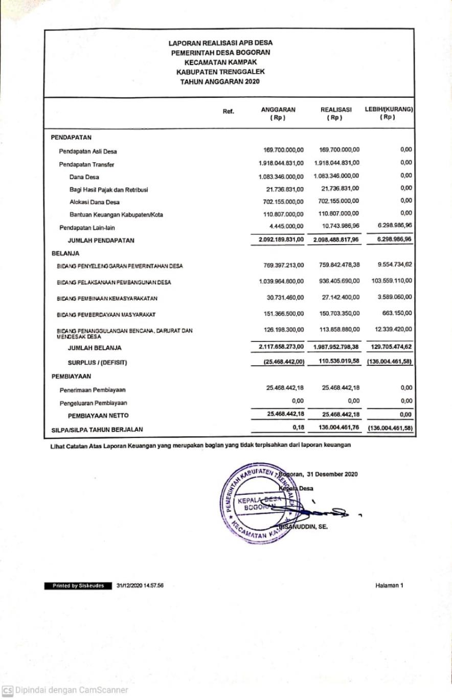 Infografik laporan pertanggung jawaban realisasi pelaksanaan APBDes Desa Bogoran tahun anggaran 2020, merupakan bentuk transparansi publik terkait pengelolaan desa selama tahun 2020, yang disusun berdasarkan peraturan Desa Bogoran tahun 2021tertanggal 26 januari 2021.