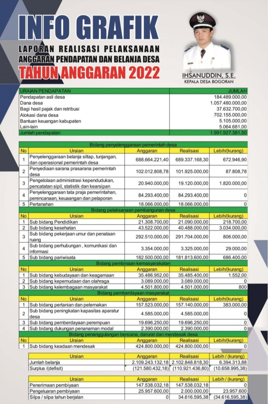 Berikut adalah Infografik APB Desa Bogoran Tahun 2023 Beserta Laporan Realisasi Pelaksanaan Anggaran Pendapatan Dan Belanja Desa Tahun 2022.